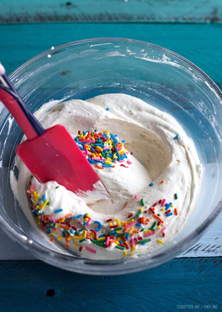 Add your sprinkles to the bowl, and mix into the dip using a spatula.